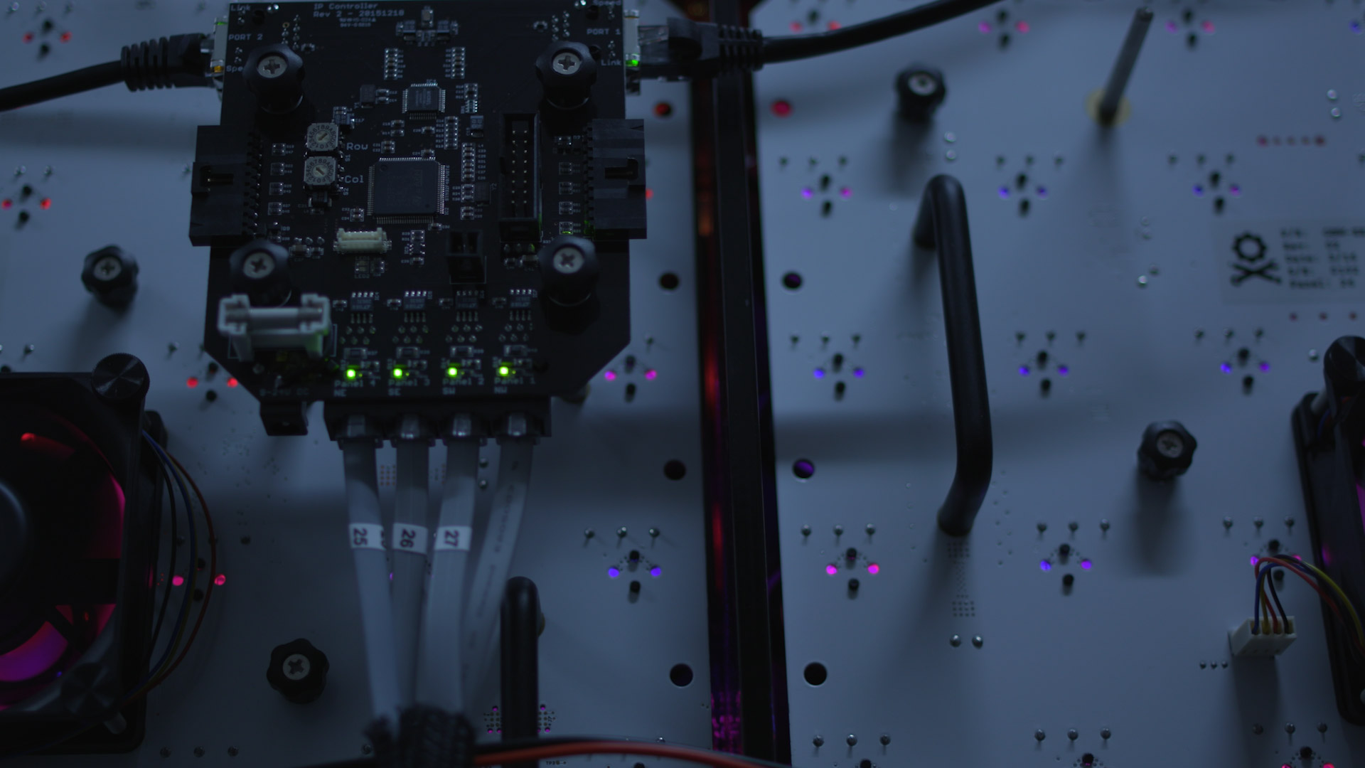 At the heart of Anypixel is a custom-designed PCB that coordinates power distribution, LED brightness control, and button state across hundreds of buttons simultaneously. We worked with Deeplocal to make this production-ready. Boards were designed using EAGLE schematics, with STM32 microcontrollers running custom C firmware. The system is modular — each board handles a subset of buttons, and boards chain together to form the full 5,880-button display.