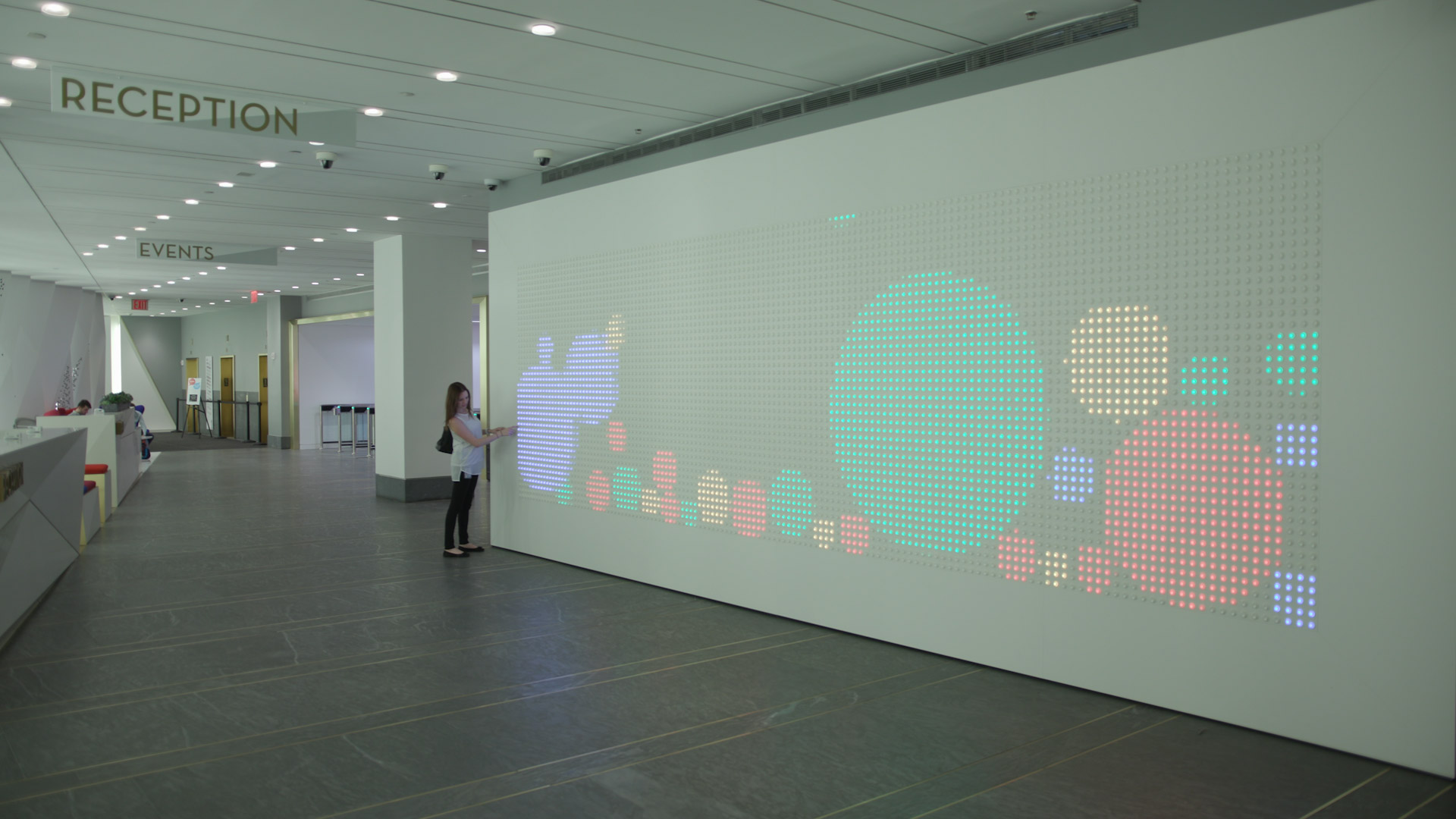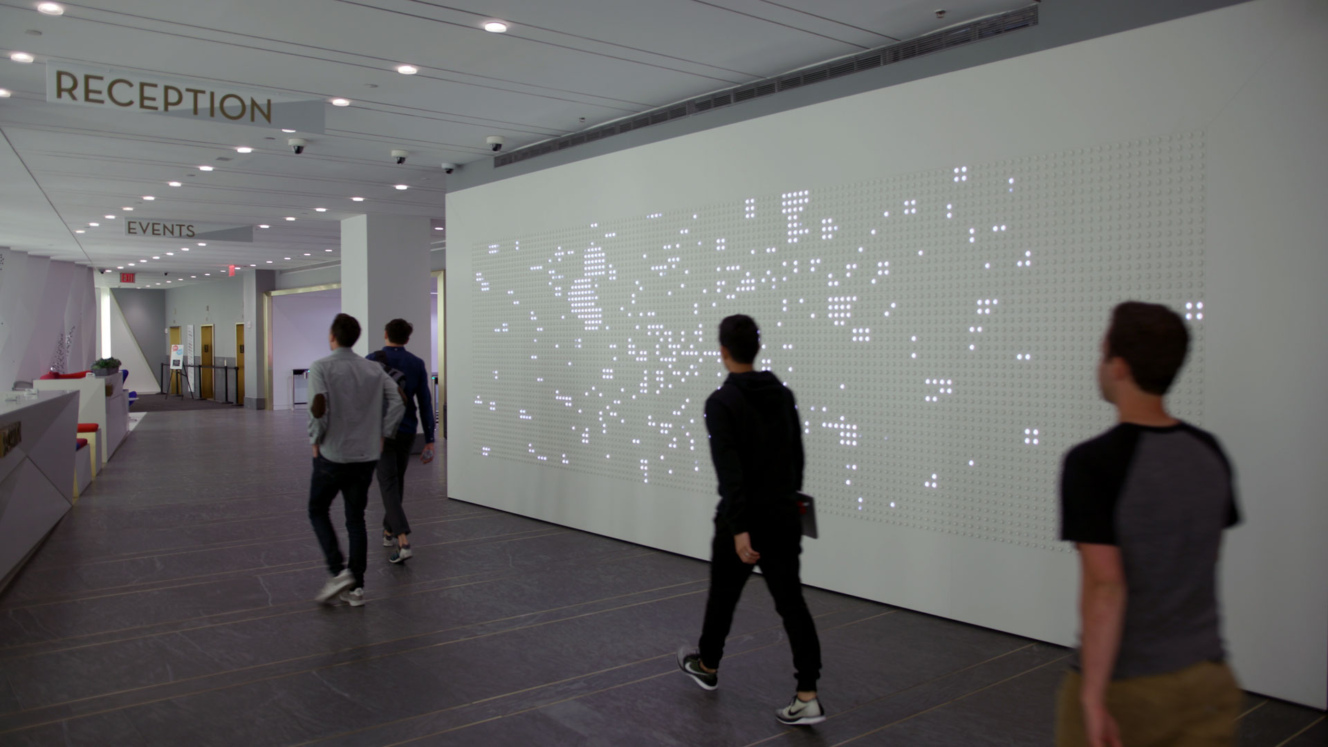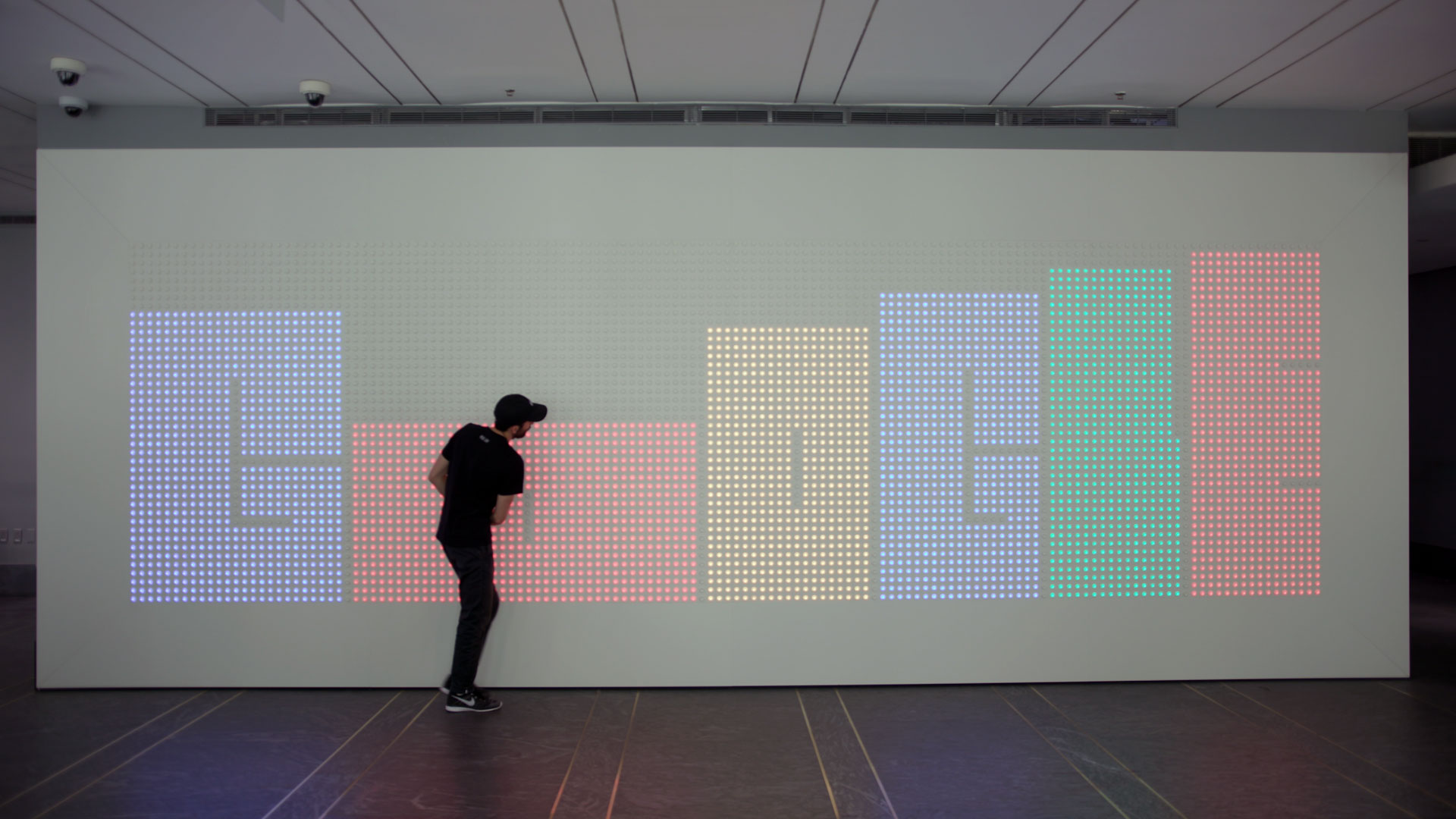 Anypixel is a permanent installation in the lobby of Google's New York headquarters at 8th Avenue — a 140-column by 42-row grid of 5,880 arcade buttons, each with a super-bright LED embedded in its core. Press a single button and it lights up triggering large-scale interactions. Together, these arcade buttons form a massive, low-resolution, multi-user, multitouch display for everyone to walk up and play with.